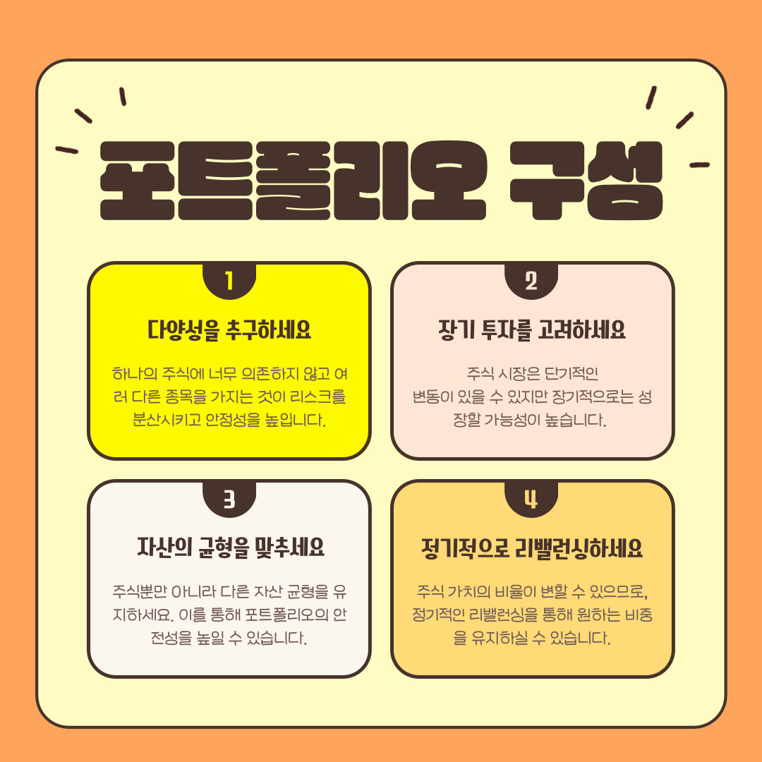 주식 투자에서 가장 중요한 것은 리스크를 관리하는 것입니다. 단일 종목에 집중 투자하는 것보다는 여러 종목에 분산 투자하는 것이 훨씬 안전합니다. 분산 투자는 특정 주식의 가격이 하락하더라도 전체 포트폴리오에 미치는 영향을 줄여줍니다. 또한, 초보자는 자신이 잘 아는 분야나 산업에 집중하는 것이 좋습니다. 예를 들어, 자신이 일하는 분야의 회사나 일상에서 자주 접하는 브랜드의 주식을 사는 것이 이해도를 높이고, 투자에 대한 자신감을 키울 수 있습니다. 또한, 주식 외에도 채권, 부동산 등 다양한 자산에 분산하는 것이 리스크 관리에 도움이 됩니다. 따라서 분산 투자와 리스크 관리 전략을 잘 세우는 것이 안전한 주식 투자로 이어질 수 있습니다.